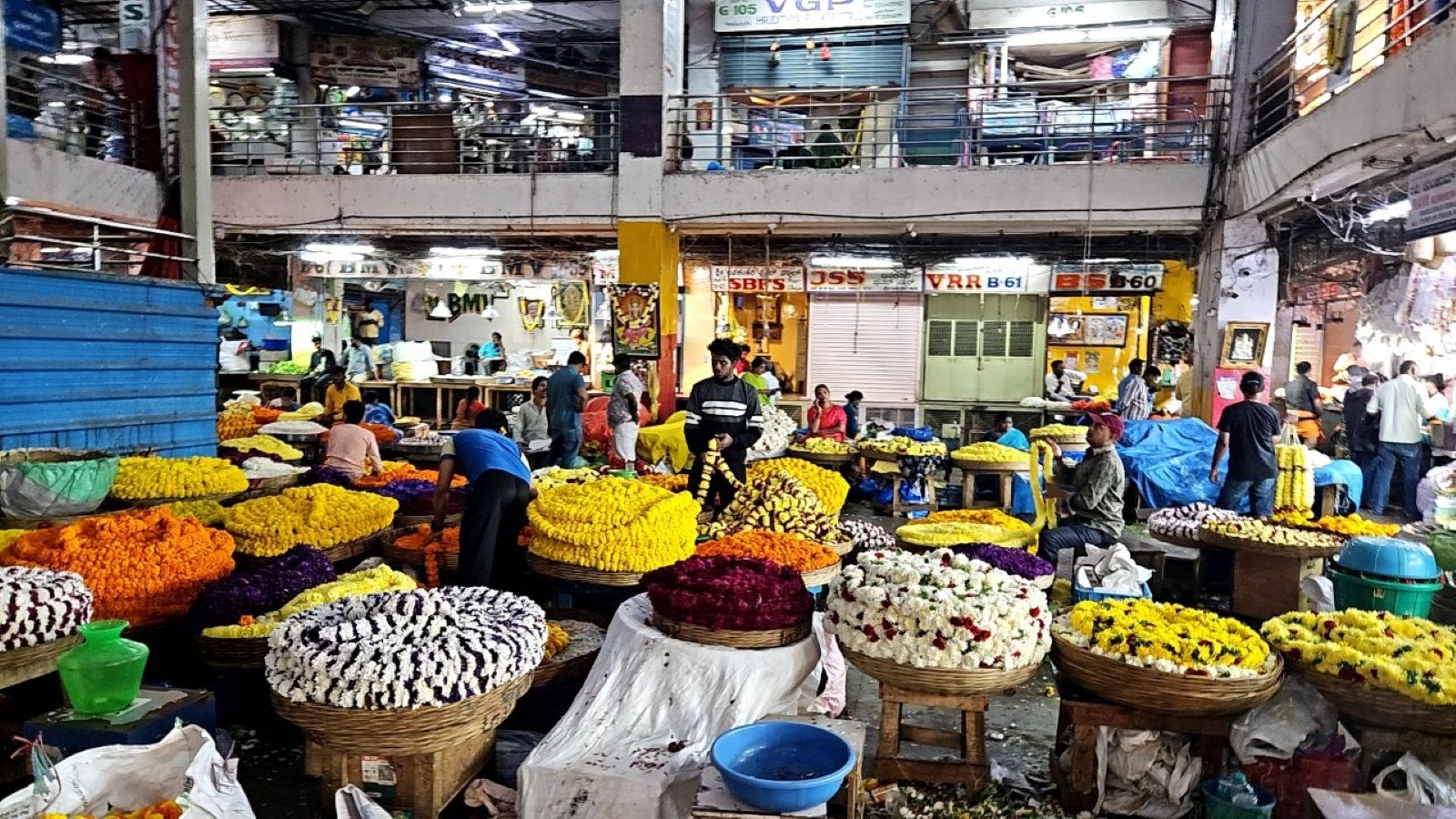 地下には赤やオレンジの色鮮やかな花市場が広がっていました。人も動物も、きれいに積まれた野菜やゴミが散らかる通路も、すべてが混ざり合ったまま、そこにありました。