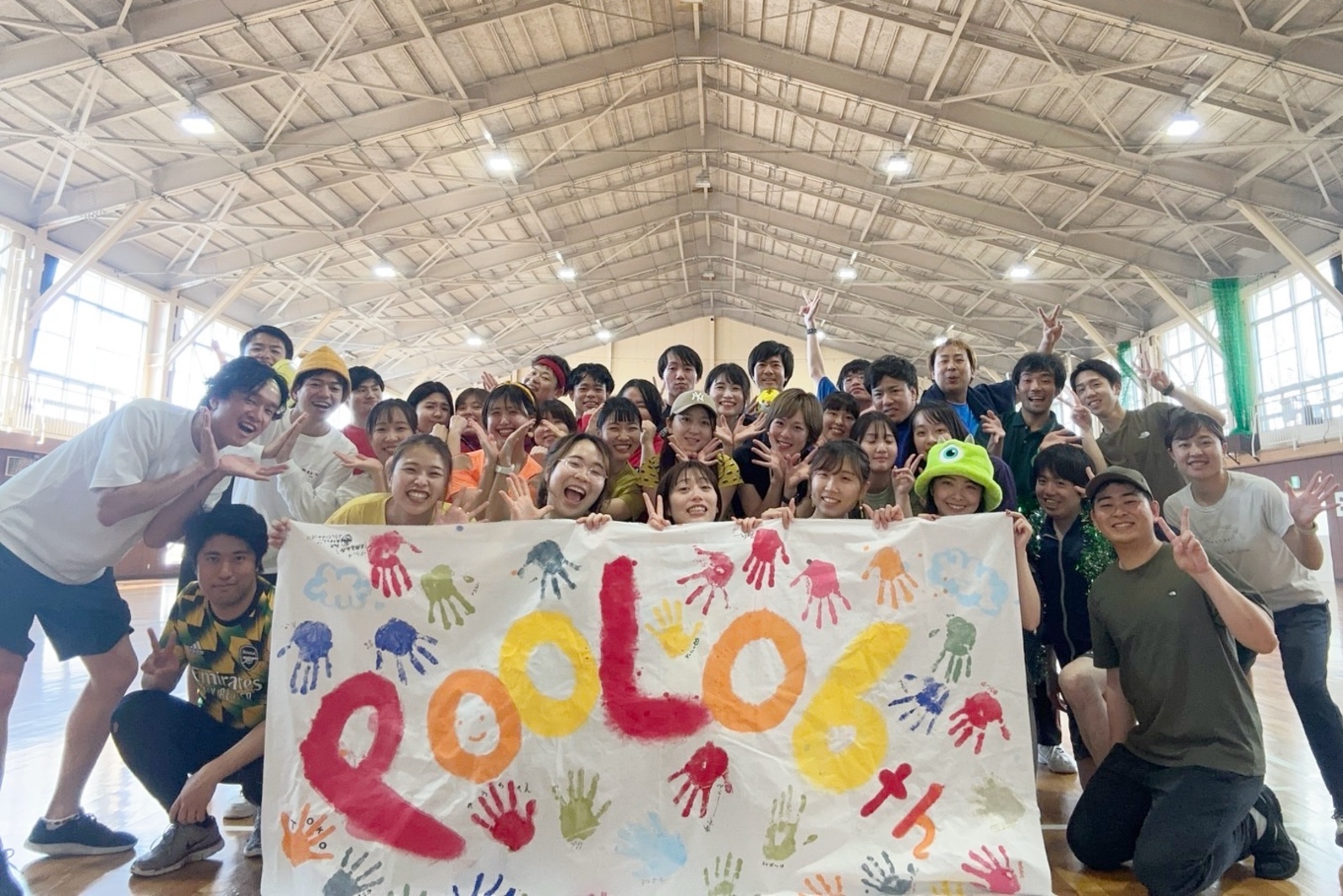 POOLO LIFE 6期の仲間たちと、卒業旅行のひとコマ。笑顔があふれる開放的な体育館で、手形アートに込めた思い出とともに