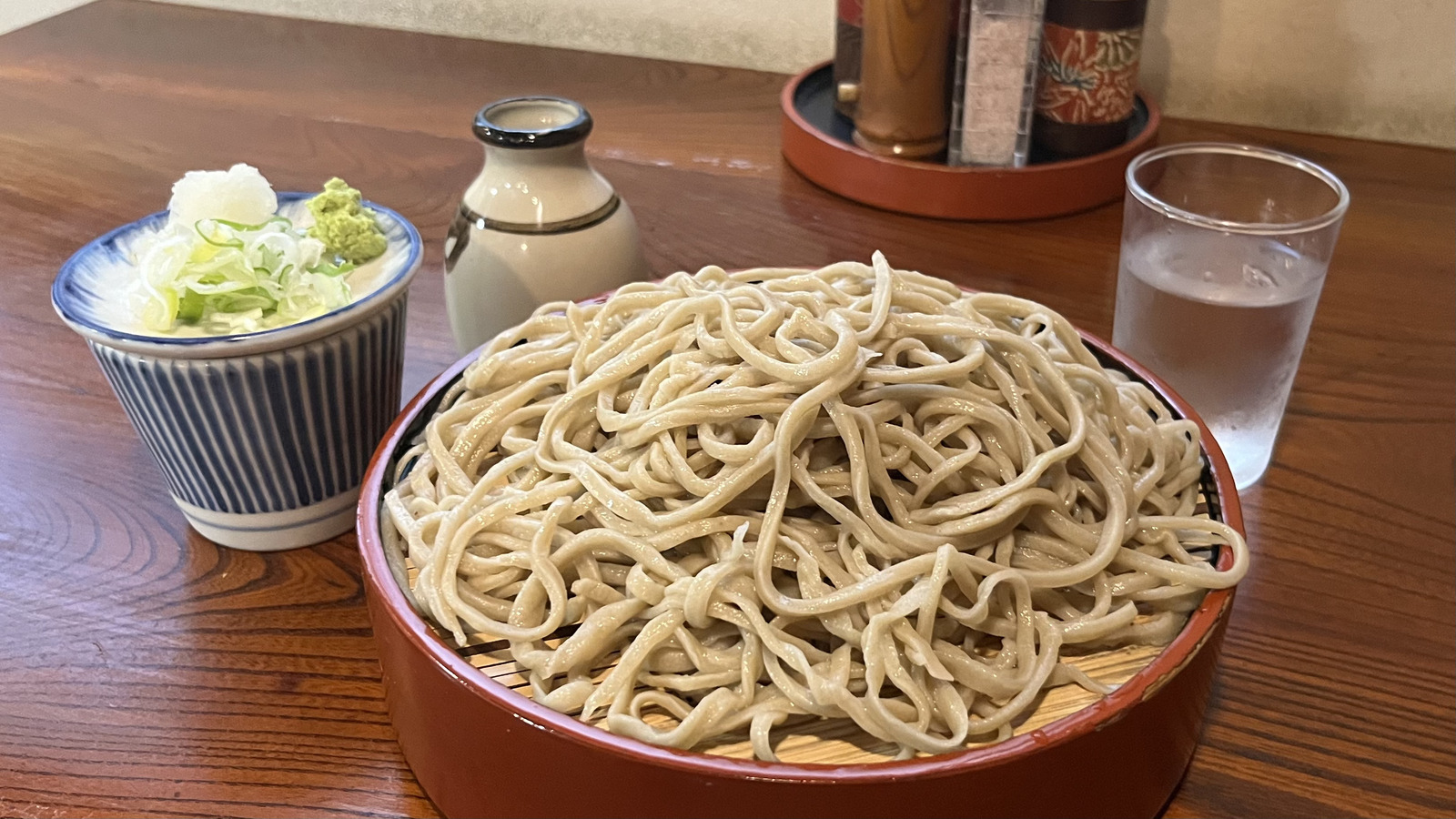 到着後店の前には行列があったが、回転も早く日曜のお昼に15分ほど並び店内へ。ざるそばは小・中・普・大と4種類のサイズ表記があり、おすすめしていただいたスタッフさんに「量には気をつけてください」と忠告があったことを思い出した。普通サイズの「普」で、通常のおそば3枚分程の量があるらしい。