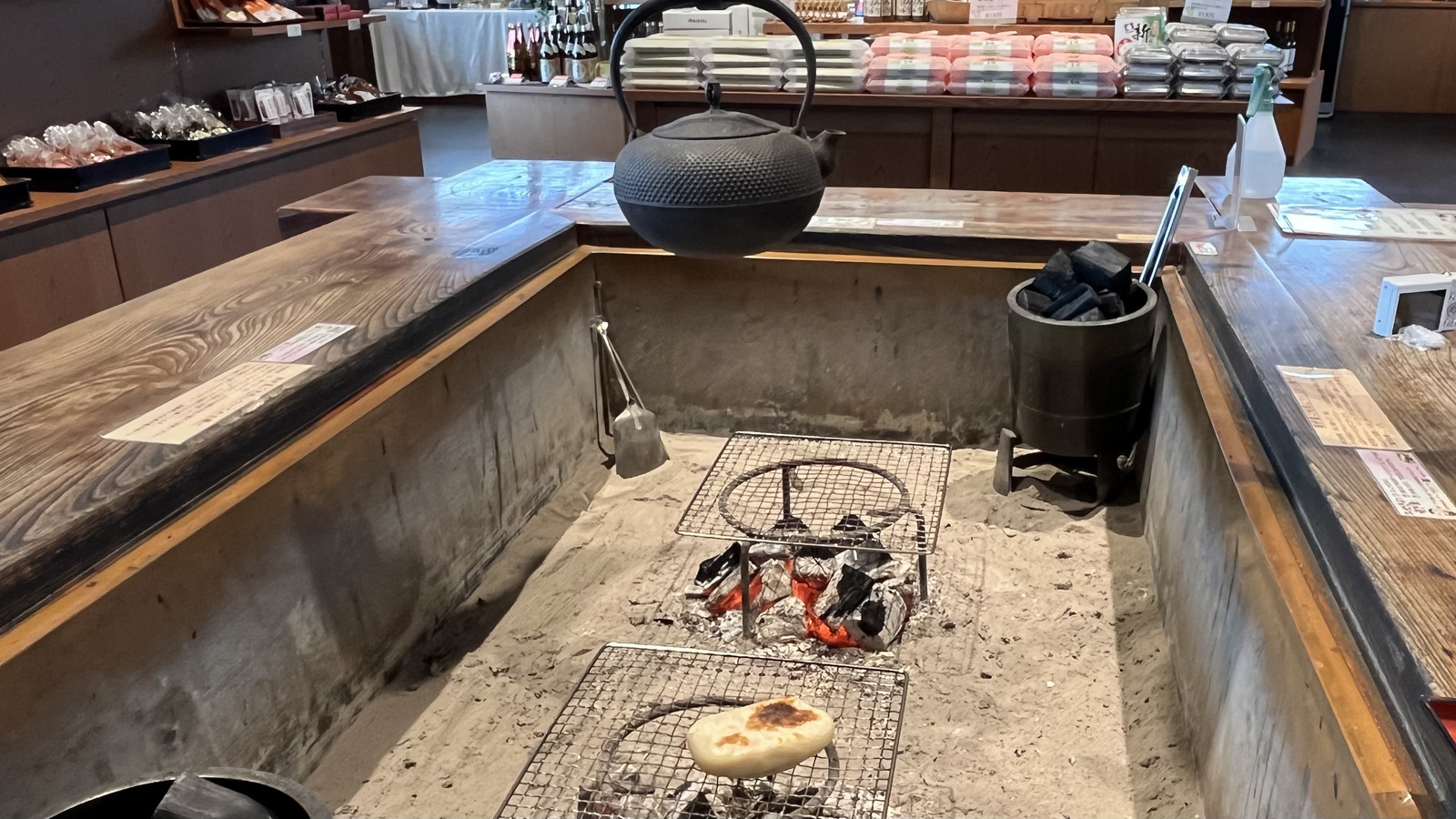 購入したおやきはすぐに炭火が入っている囲炉裏で焼き食べることができる。おやき以外にも特産品であるわさびやワイン、そば等も販売されているためお土産を選びながらアツアツのおやきを楽しむのも良し。長野県に来た際はぜひ立ち寄って欲しいお店。