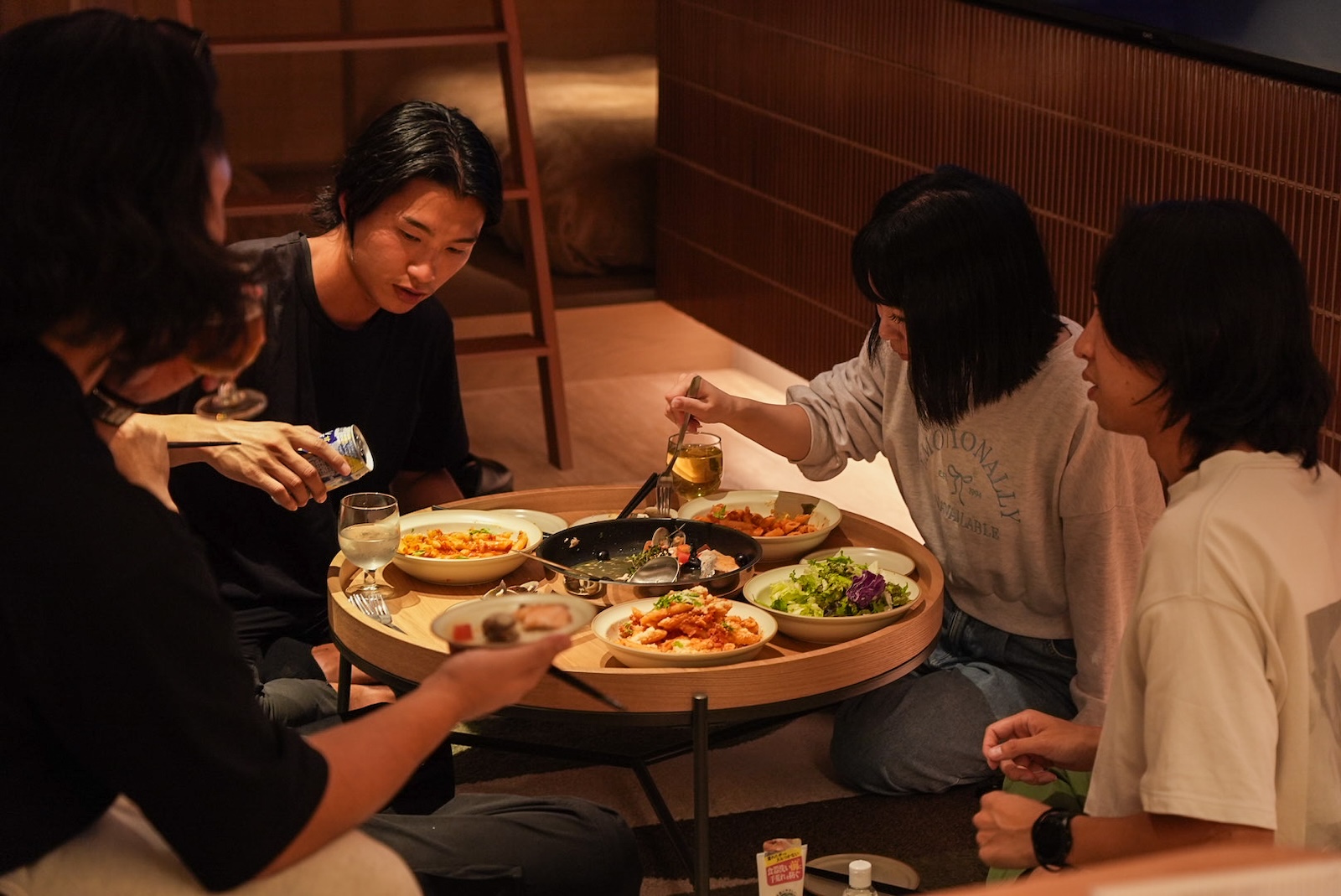 せっかく集まって一緒に滞在するグループのメンバーたち。終電も、飲食店の閉店も、なんなら真夜中の空腹も気にすることなく、好きなものを作り、みんなでごはんを食べて夜更けまで語り明かしたい。