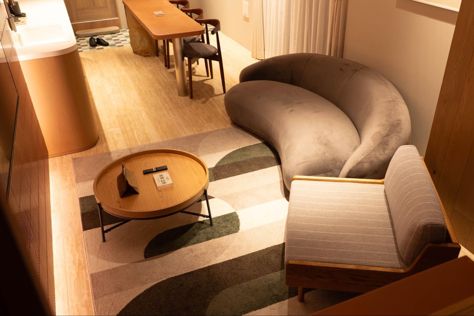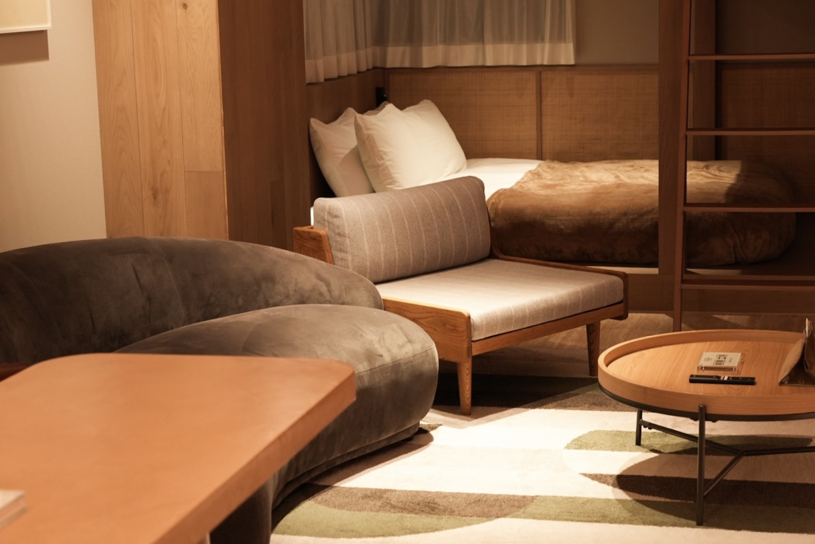 都内のホテルの一室とは思えない広さのリビングには、つい腰を下ろしたくなるソファと、自然と囲んでコミュニケーションが生まれそうなローテーブルが配置されています。