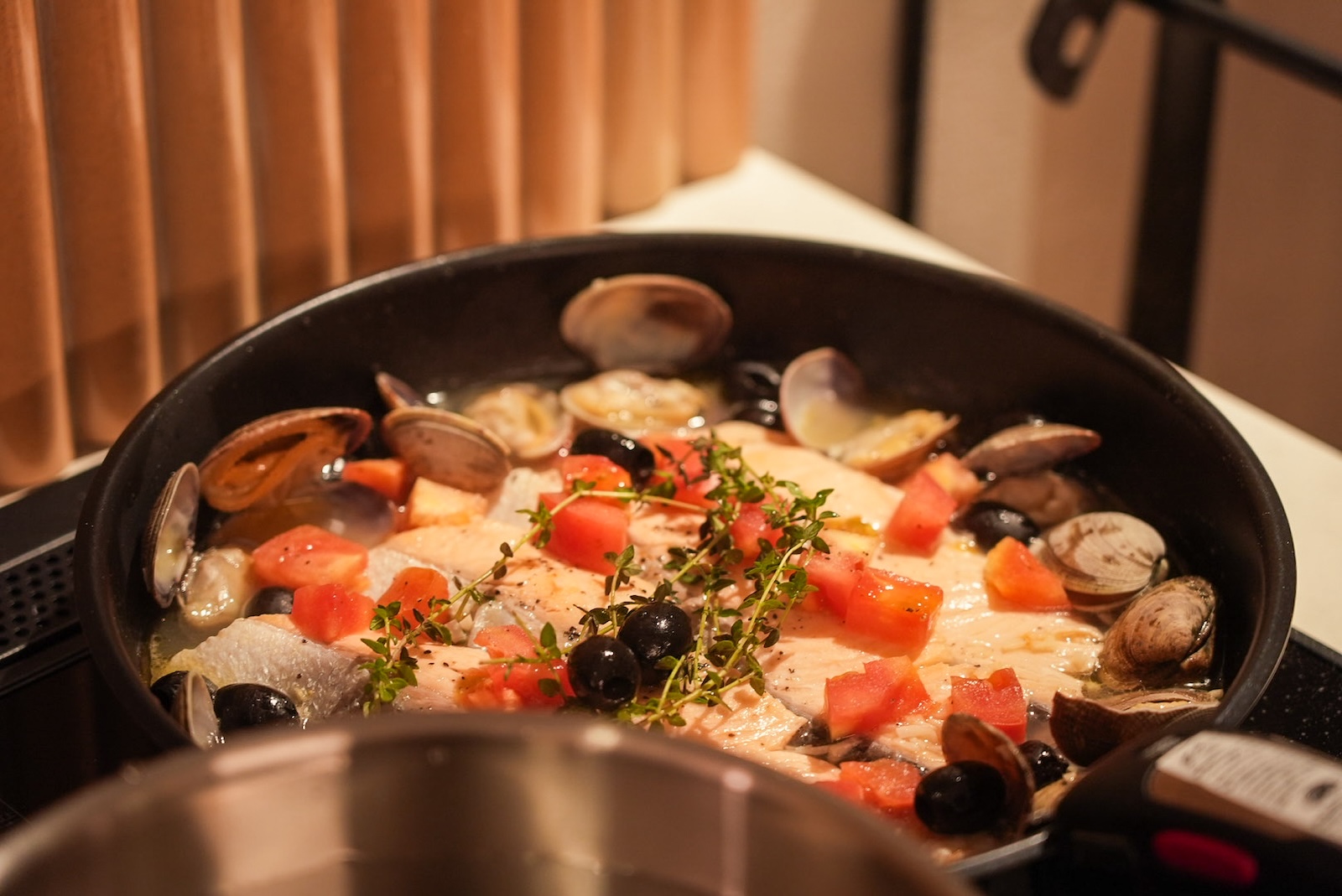 フライパンを使って、おしゃれな客室にあわせてアクアパッツァを