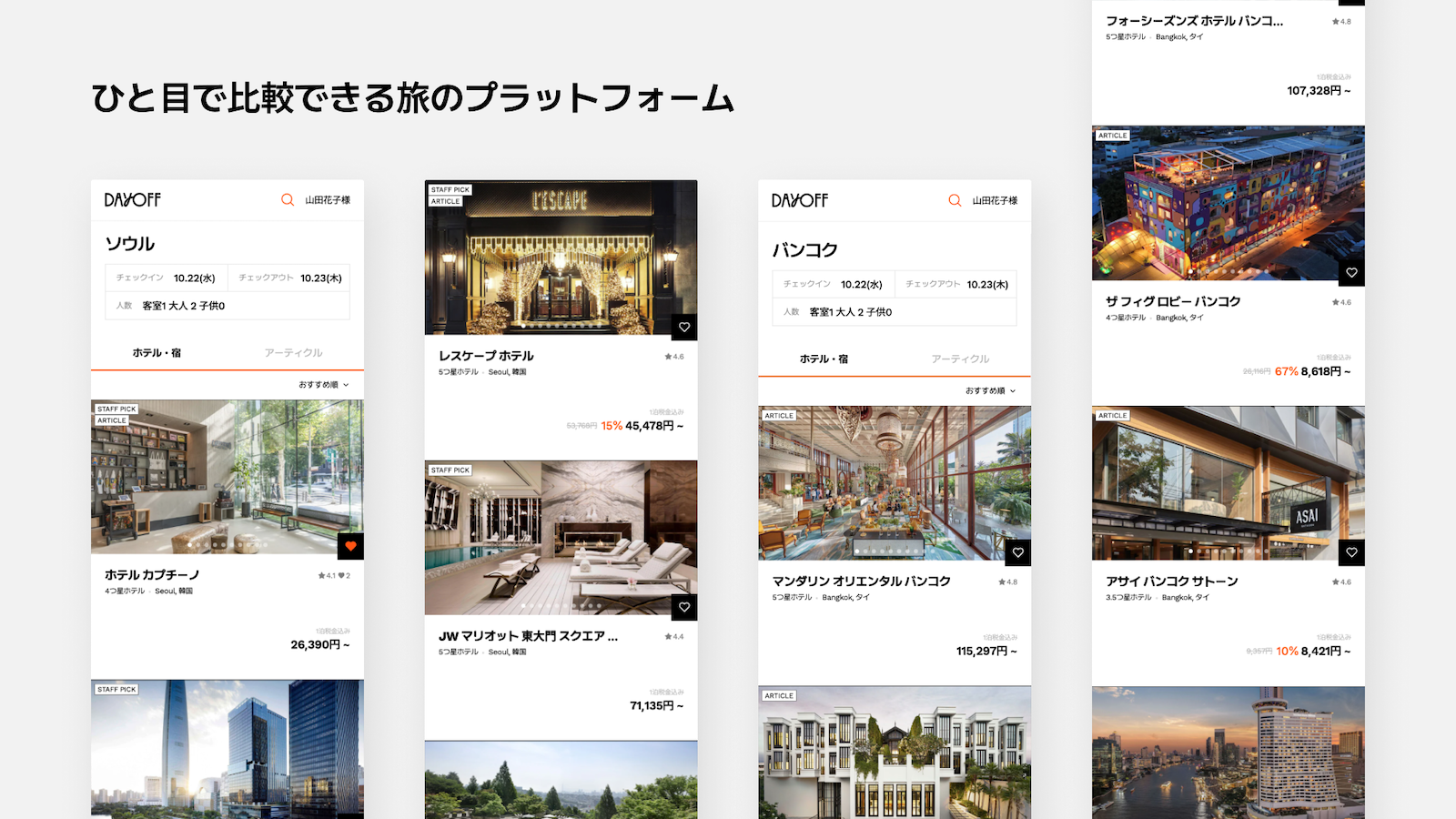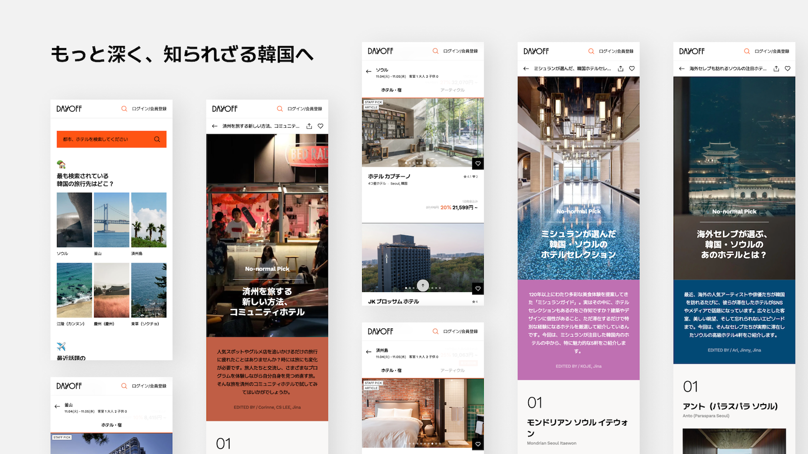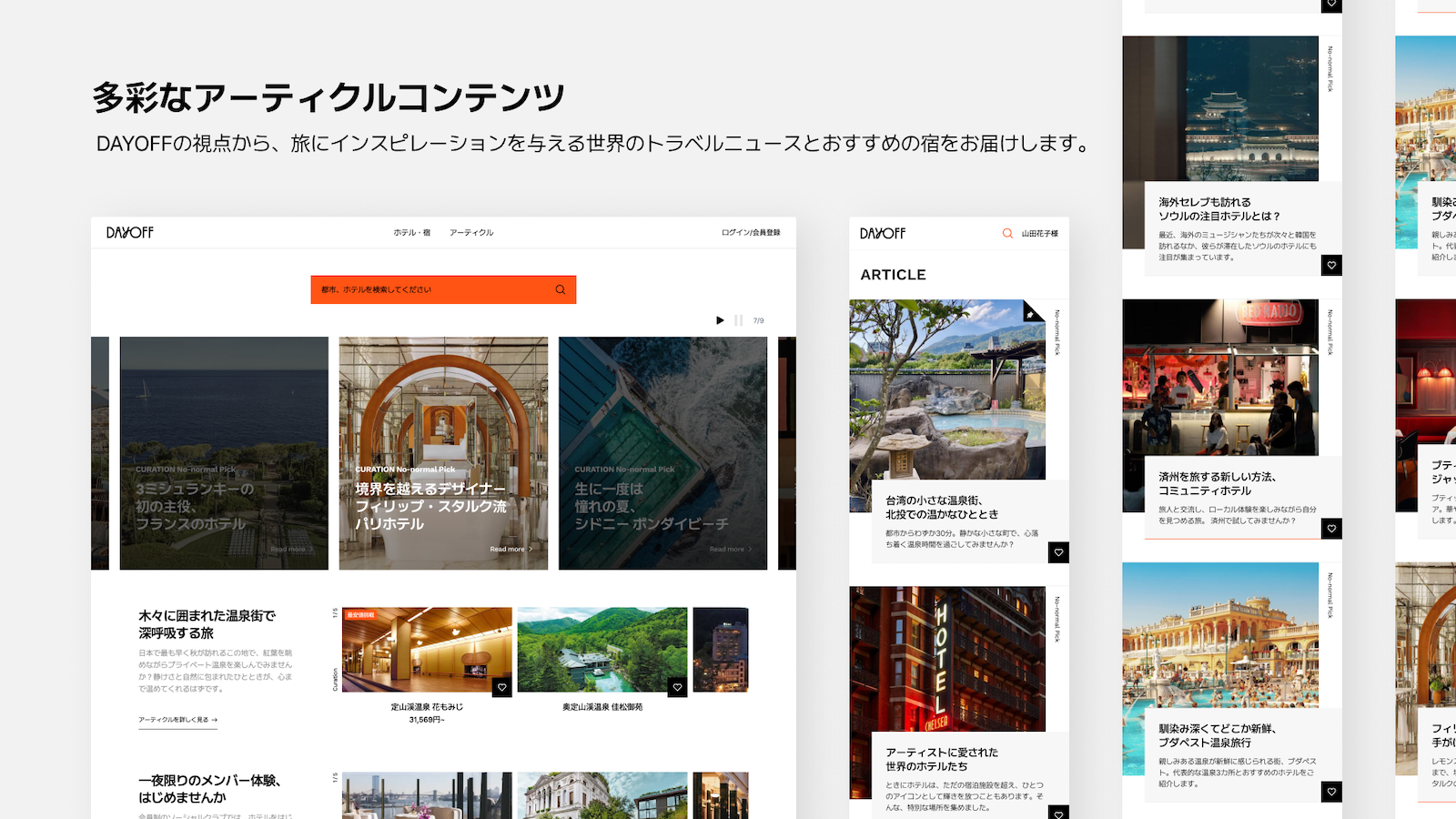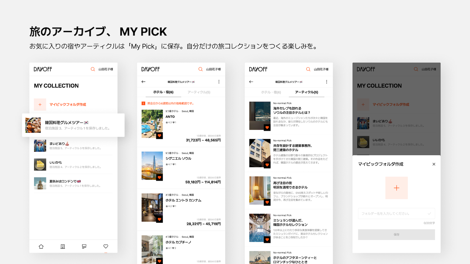 「私の好みの旅を見つける場所」というスローガンの通り、「DAYOFF」は「旅にインスピレーションを与える記事」と、それをアーカイブする「My Pick」といったオリジナル機能で、ほかの予約サイトではできない価値を提供してくれます。