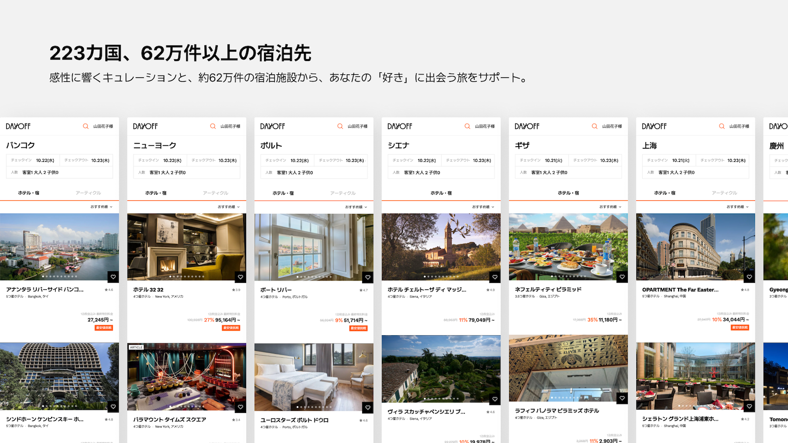 「DAYOFF」は、全世界223カ国、62万件以上という膨大な数の宿泊施設を取り扱っていますが、このプラットフォームの魅力は単なる掲載数の多さや設備情報の丁寧さ……だけではありません。