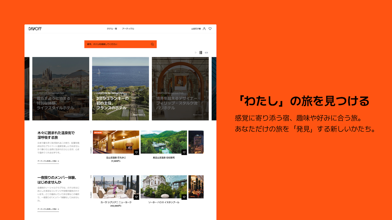 「DAYOFF」は、じぶんの旅の好みを深め、本当に求める休息と感動を提供してくれるプラットフォームです。