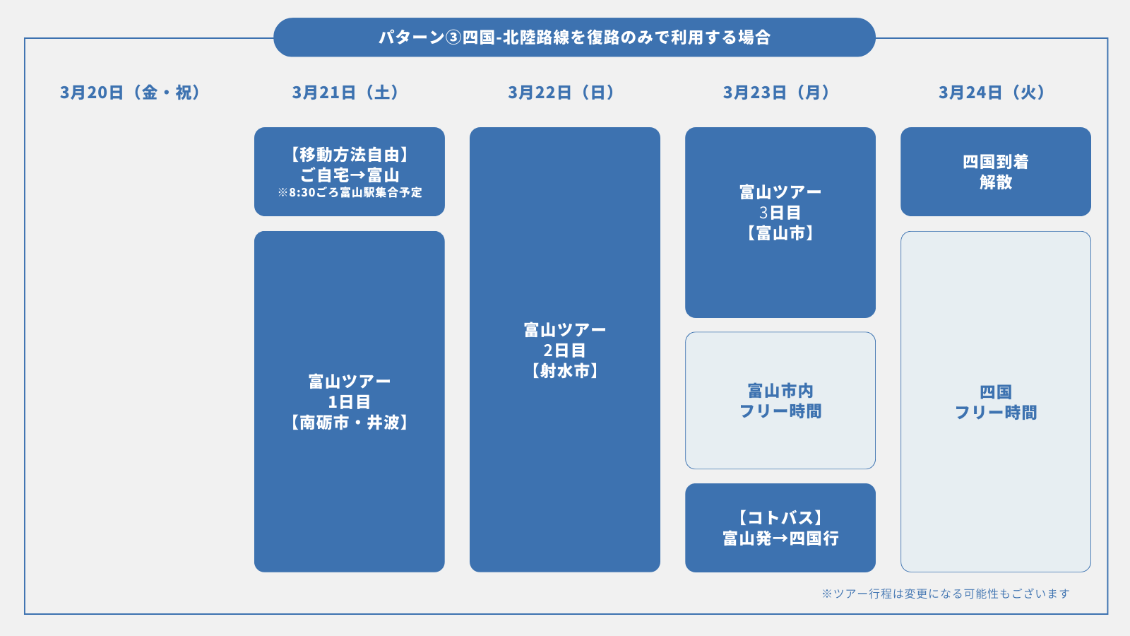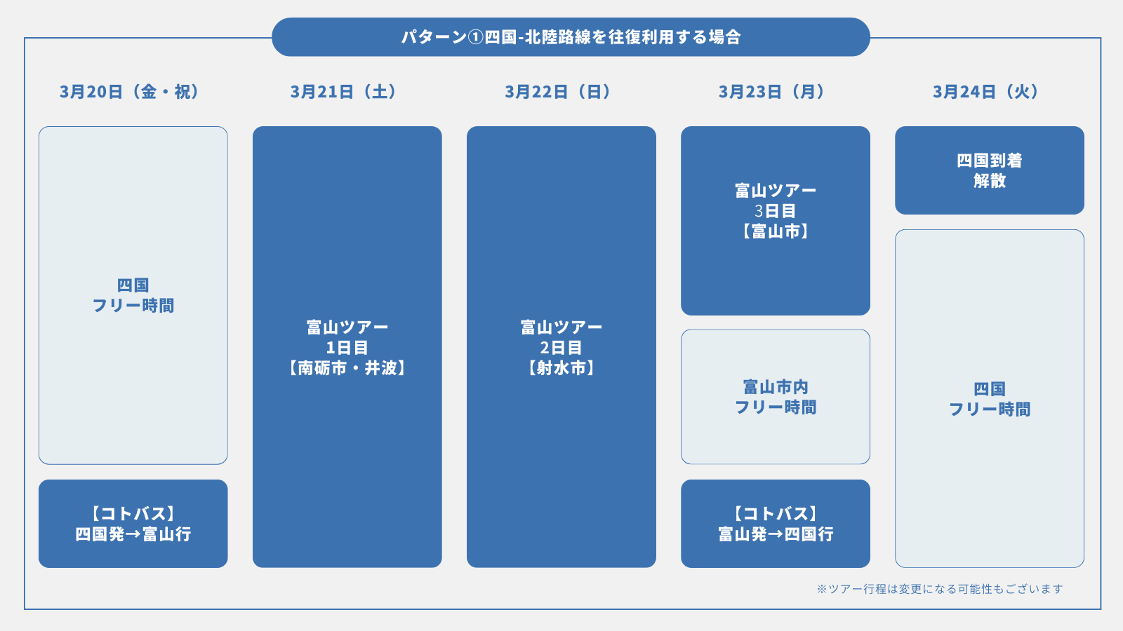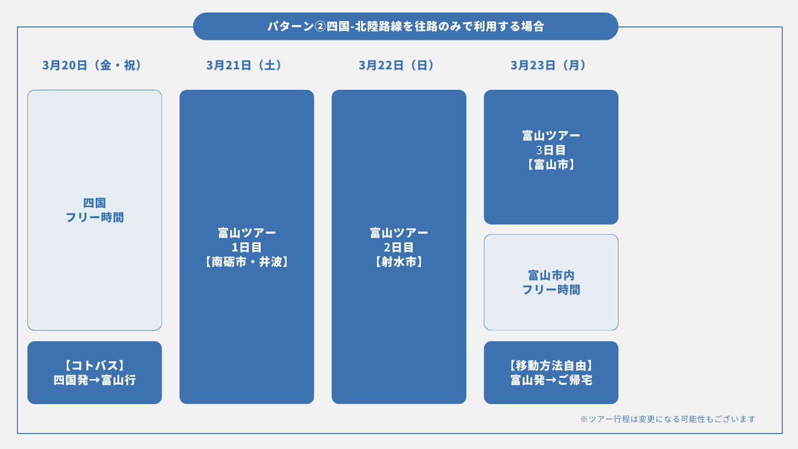 ②-③:往路または復路のいずれかでコトバスの「四国(香川・愛媛・徳島・高知)-富山」路線を利用していただく場合