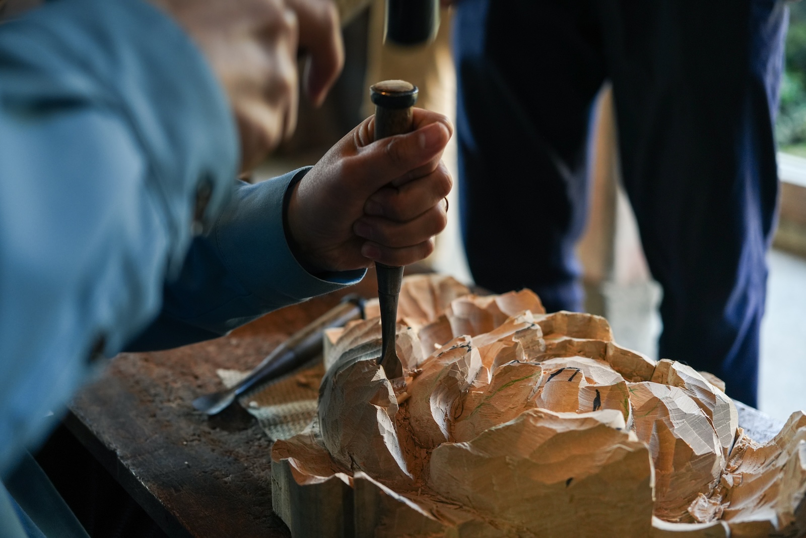 実際に荒彫りを体験してみると、職人の豪快かつ繊細で正確な手さばきに圧倒されます。まさに神業。削りたての木の香りがふわりと漂い、作業に没頭するうちに心が安らいでいくのを感じました。