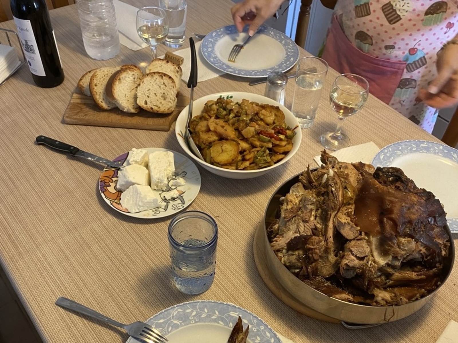 英語を少し話す伯父を介しつつ、夫は幼少期に覚えたギリシャ語を断片的に交えながら会話します。伯母は英語を話しませんが、笑顔で食卓を華やかにしていき、「どんどん食べて」と身振りで勧めてくれます。