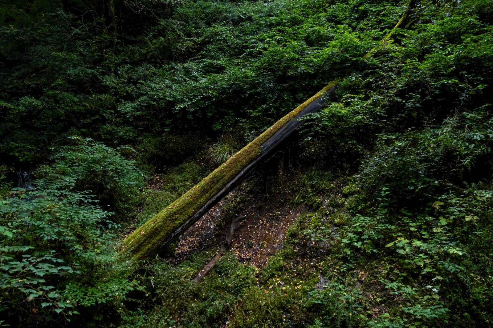 まず最初の目的地は、白糸の滝。約70mにもわたって、無数の細い滝が水のカーテンのような景色が有名です。しかし、私のお気に入りは、メインスポットの少し手前にある、大木が倒れているスポット。