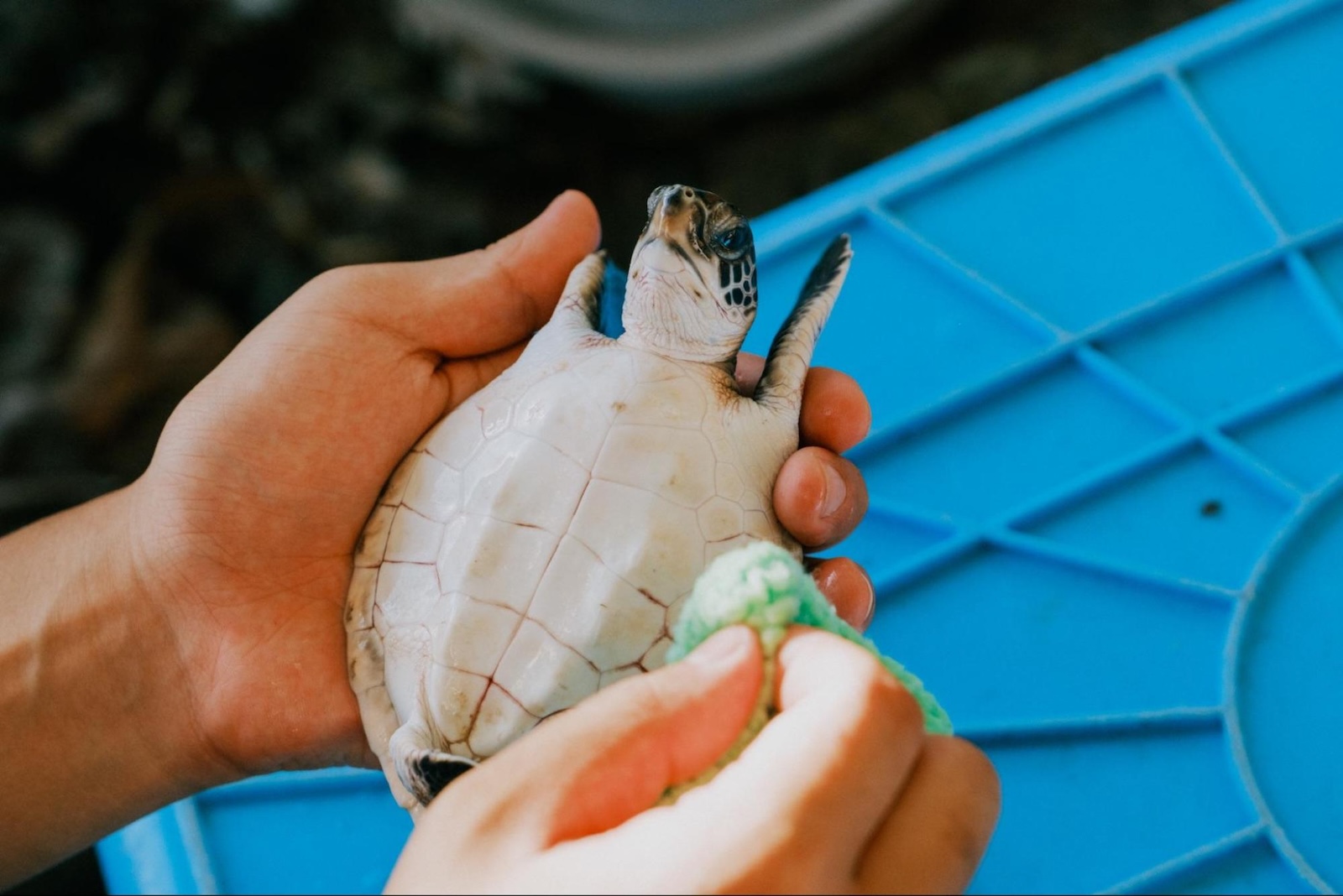 ウミガメの「甲羅磨き」にもチャレンジ。甲羅などに生える藻や寄生虫、ゴミを取り除くことで、免疫の弱いウミガメの赤ちゃんの皮膚病を予防する効果があるそう。ブラシでこすると気持ちよさそうな顔をしてくれるような気がします。