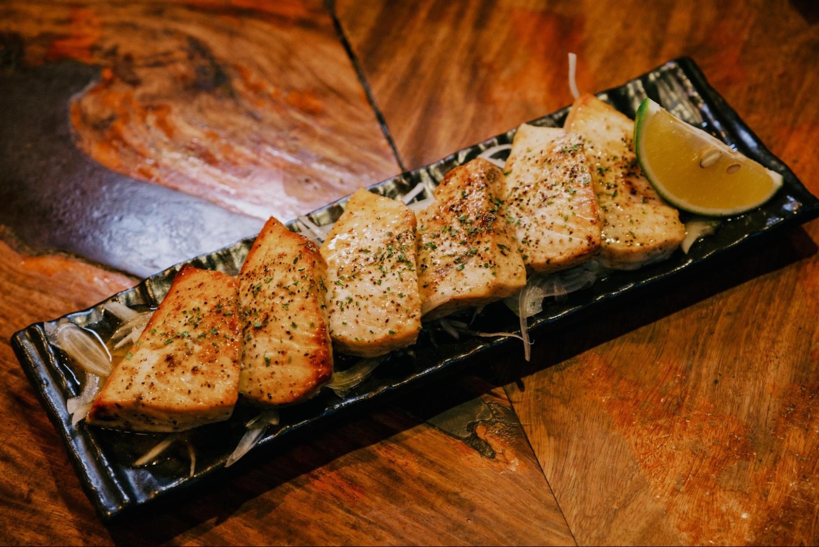 こちらは冠婚葬祭などにも出てくる伝統料理「島寿司(要予約)」です。醤油ベースのタレに漬け込んだ魚に、ワサビではなくからしを添えるのが伝統ですが、こちらのお店では島レモン胡椒と一緒にいただくアレンジが絶品です。小笠原諸島のソウルフードとも呼ばれるウミガメ料理をいただくこともできます。