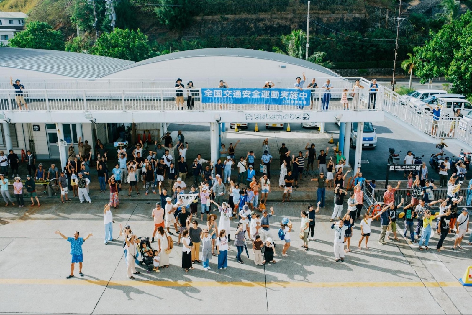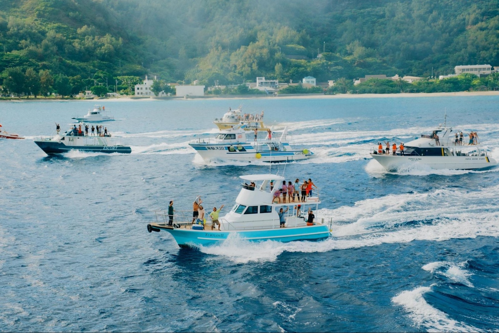 漁船や観光船が並走する見送り。旅人を温かく受け入れる父島の気質を肌で感じます。