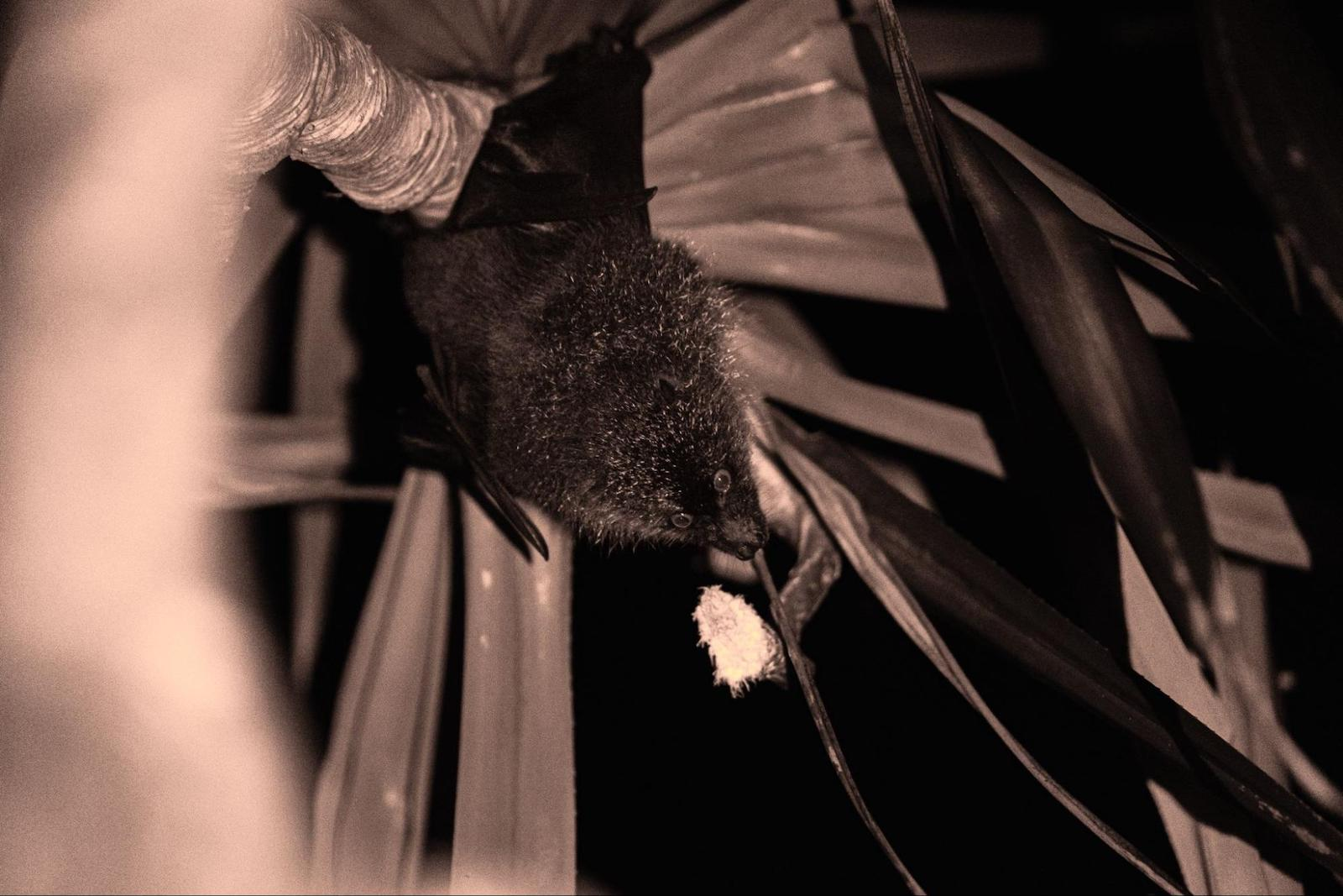 タコノキにぶら下がるオガサワラオオコウモリ