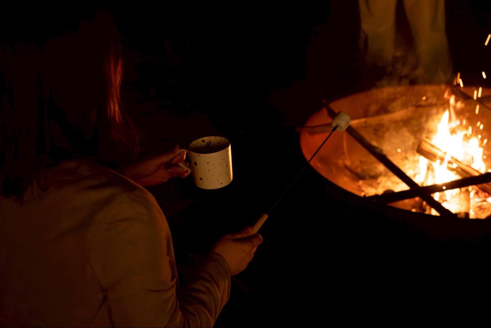 焚き火台には薪や着火剤もあるので、面倒な準備もなく手軽に着火できるのも嬉しいポイント。用意されている焼きマシュマロセットで甘いものを食べながら、燃える炎を心ゆくまで眺めたり、、星空を見上げたりして過ごします。